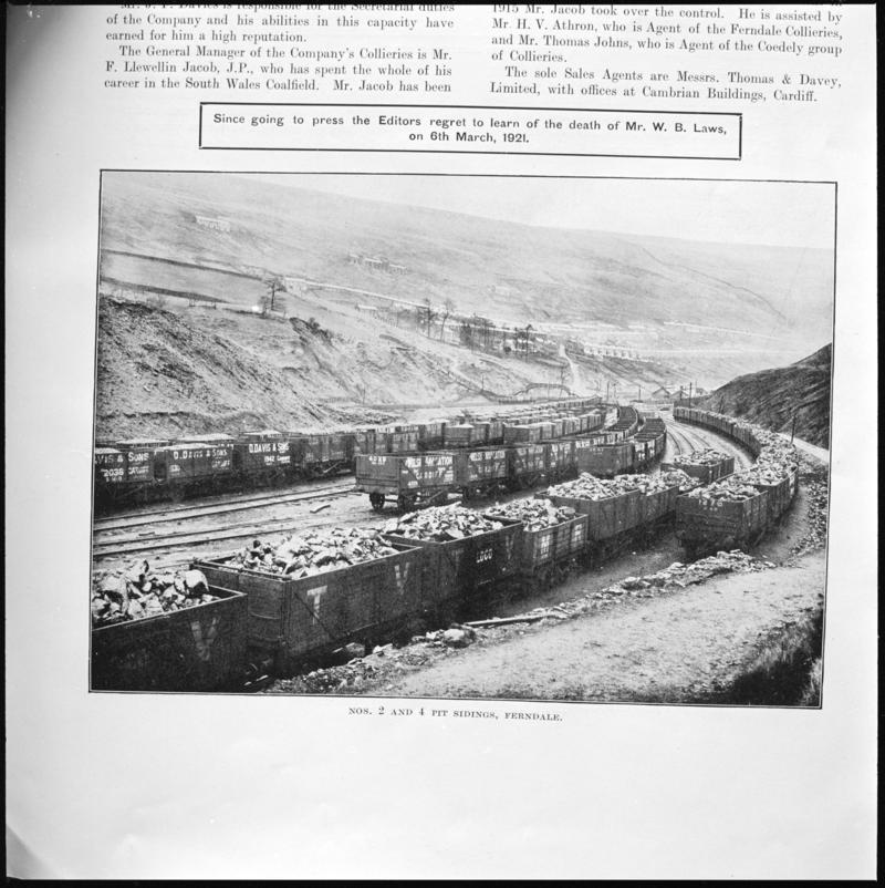 Black and white film negative of a photograph showing a surface view of Ferndale no.2 and no.4 pits. 'Ferndale 2-4' is transcribed from original negative bag.