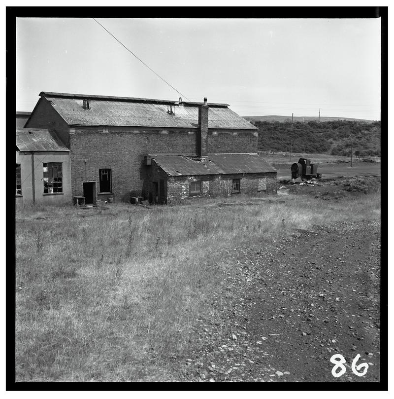 Black and white film negative showing a partly cut up locomotive with loco shed/workshop in the background. British Ironworks, Abersychan, 6 July 1975.