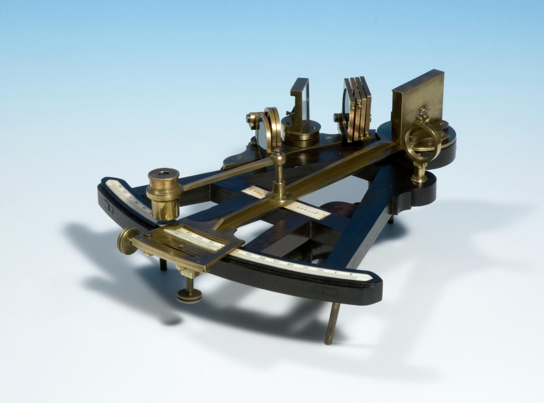 Wooden Turkish sinical quadrant with rectangular grid painted on one face of quadrant representing meridians and parallels. Other face has meridians and navigational reading with Arabic? inscription. Sides of quadrant are painted in red. There is a circular dent with a square inside marking the halfway part on the arc.