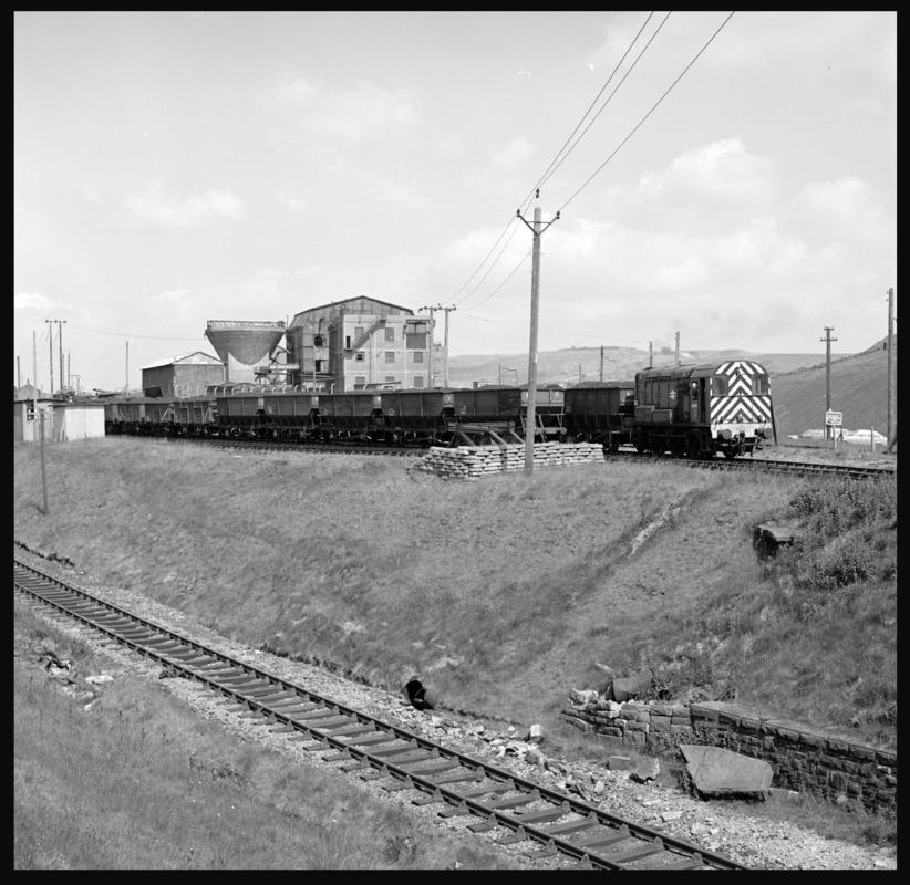 Black and white film negative of a photograph showing a group of miners on the surface, Milfraen Colliery, Blaenavon. 'Milfraen' is transcribed from original negative bag.