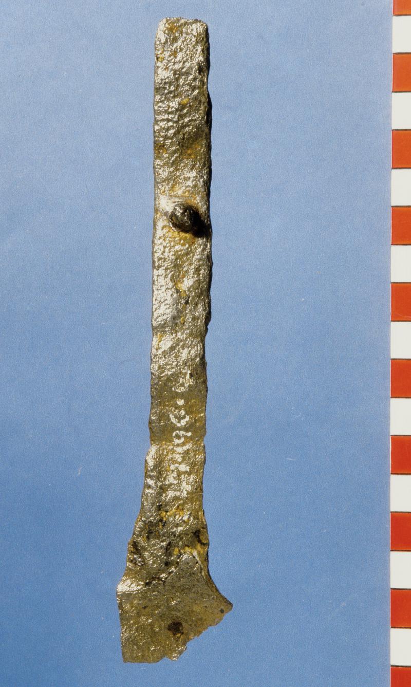Nodiadau: Found during the construction of an airfield at RAF Station Valley. Some certainly, the rest probably, from a wet meadow which formed the margin of Llyn Cerrig Bach. The exact depth below the grassy surface at which the objects were deposited is not known. The bog was excavated to a maximum depth of 20 feet. A few objects were found on the spot, after the peaty deposit had been won from the boggy margin of the lake. The rest, with the exception of 44.32/58, were found on that portion of the adjacent aerodrome on which the peat from this site had been spread. Animal bones were associated with the deposit and many metal objects were stained with vivianite.