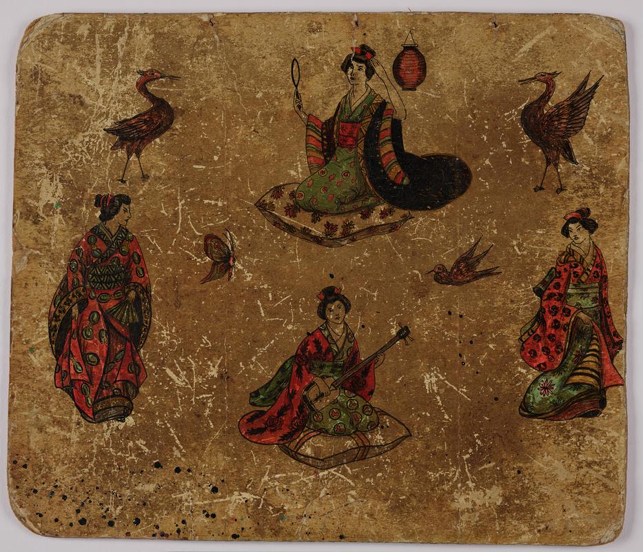 Sheet of lined paper with four coloured images of tropical birds cut out and stuck on. From a collection formerly belonging to tattoo artist Jessie Knight