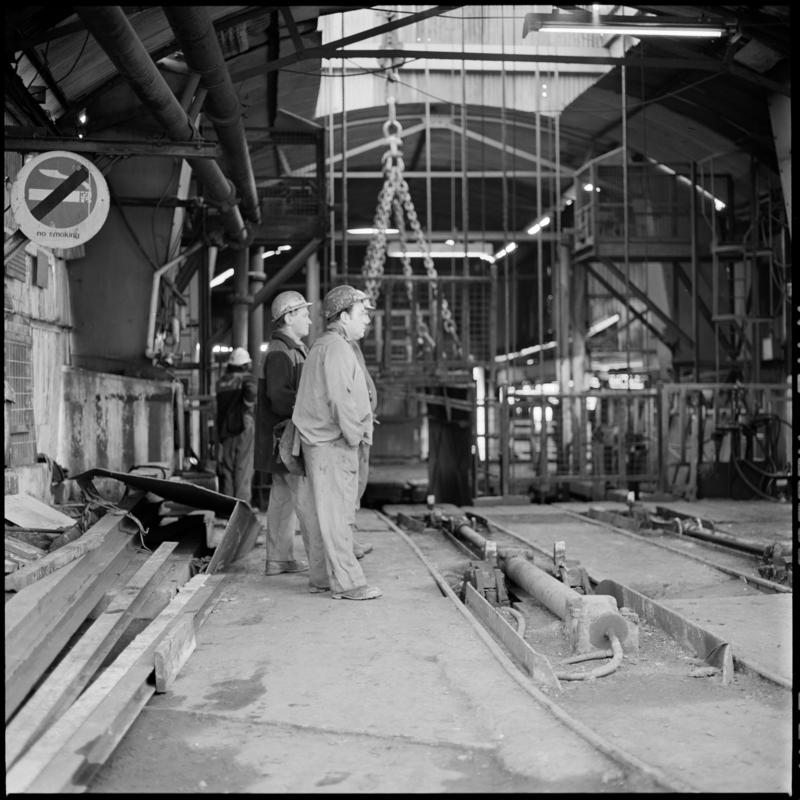 Tram cages at the top of the downcast shaft, Taff Merthyr Colliery.