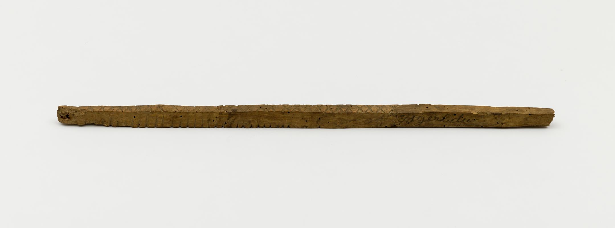 Double whistle, type used by shepherds. Maker's mark stamped in three places, and the letters G, D, and C. Small peg attached to loop.