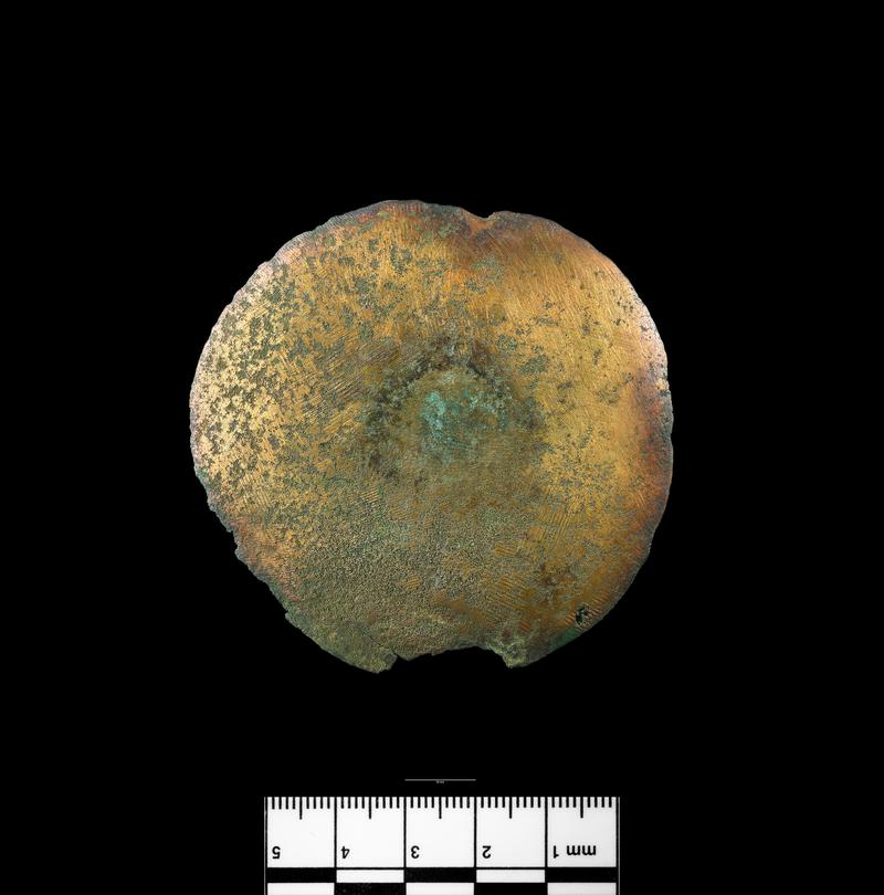 Harness stud of common type, with an inserted stud. The decoration is disposed in a central disc surrounded by two rings. The centre is red enamel: the inner ring is of blue-and-white chequered glass mosaic in a blue background, and the outer ring originally had eight chequers of blue-and-white outlined in red, spaced symmetrically in a seting of yellow enamel.