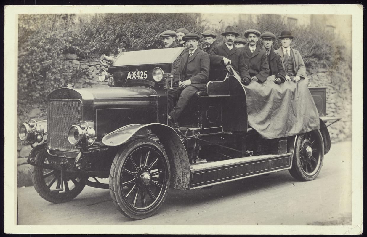 Photograph taken at Crumlin Rescue Station showing Llanhilleth Colliery rescue team (including brothers Charles and Albert Adams) wearing full breathing apparatus, 1911. Printed on postcard. Unused.