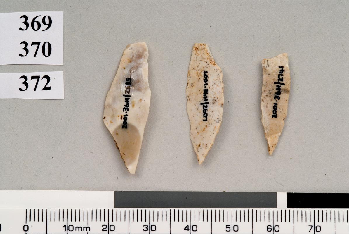 Microlith of obliquely blunted point form. The retouch lies on the left hand side. The termination is feathered with a break near the base. The tool has a white patination.