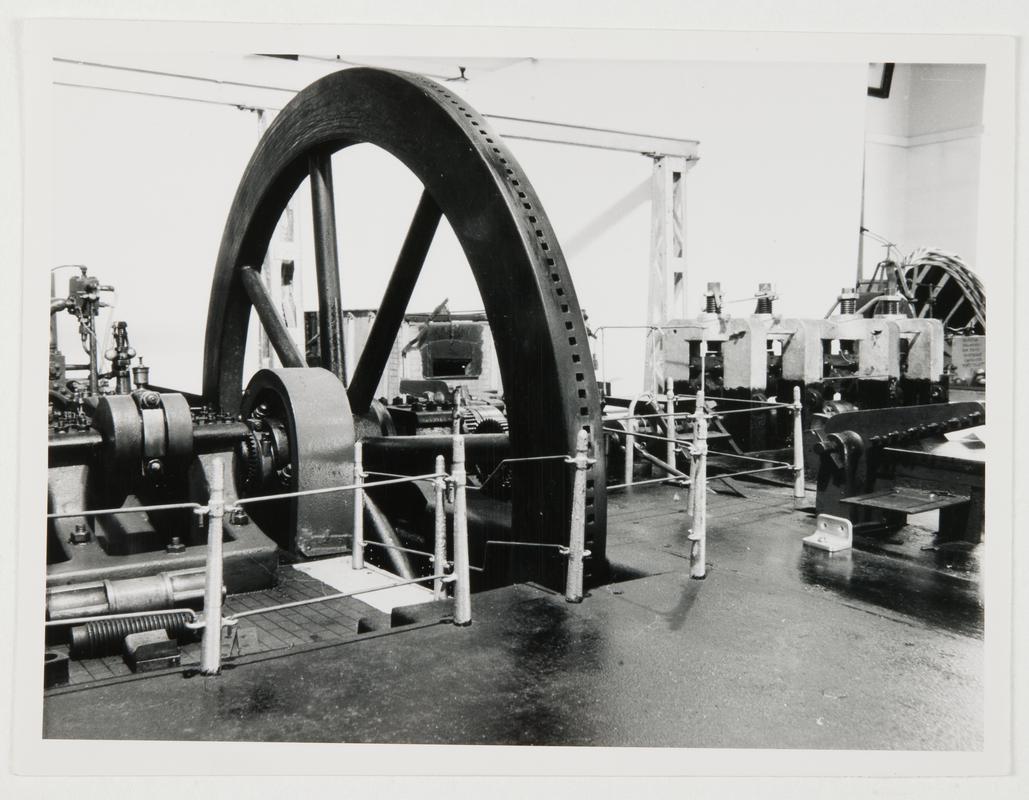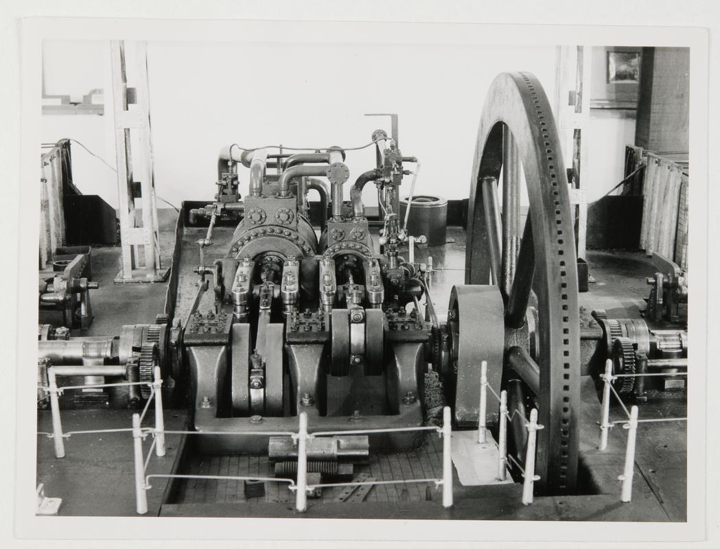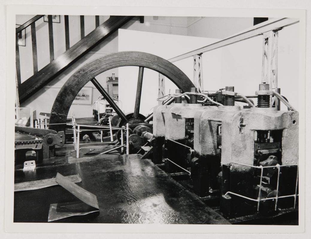 Photograph showing a label for a scale model of a cross compound steam engine used to drive 2 mills at the Eaglesbush Tinplate Works, Neath. Photograph taken at Trostre Works Museum. Photographer's stamp on back.