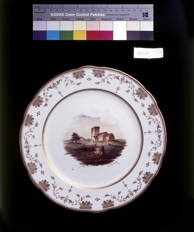 Plate, soft-paste 'duck egg' porcelain with a greenish translucency; standing on a straight sided foot rim curving into rounded sides with everted lip; lobed edge with four large and four small lobes, and cruciform moulding; around edge a wide band of pale green enamel, reserved with four cartouches of garden flower sprays with borders consisting of four c-scrolls; a flower sprig in the centre bordered by a plain gilt circular band; gilt band to lip ( very worn ).
