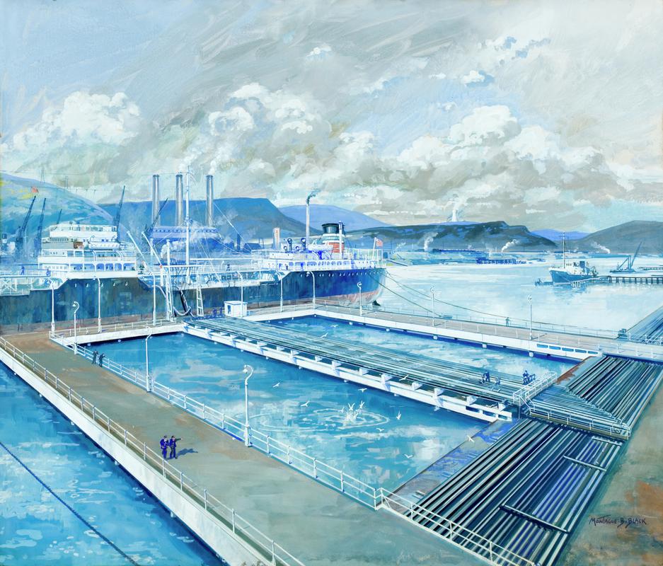 General view of Swansea Docks. Signed and dated '75 bottom left. Framed.