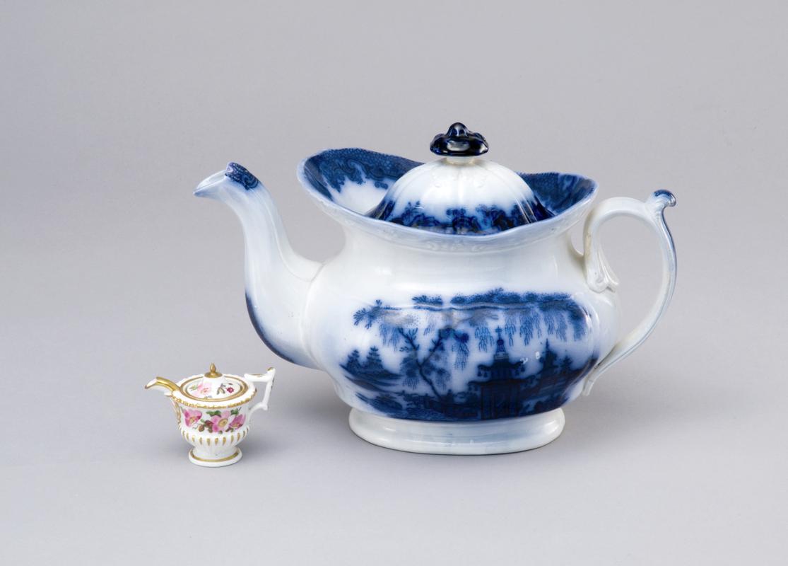 Teapot, soft-paste porcelain, with a pinkish-yellow translucency; standing on a pedestal foot moulded with acanthus leaves below beading, krater vase-shaped, with gadrooning on the lower part, and acanthus leaf and beaded moulding on the flared flanged lip; ( cover and handle missing, and spout broken ); glazed, undecorated.
