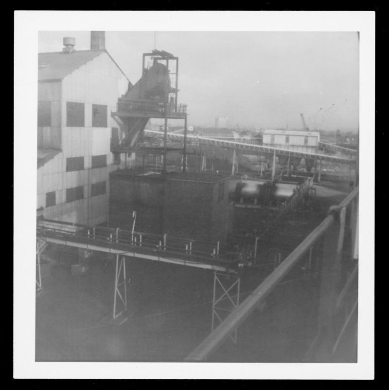 View showing John Bovell in overalls and safety helmet. John Bovell was foreman of the briquetting operation at Crown patent fuel works, Cardiff. The Crown fuel works was located in Cardiff Docks, and operated by the Coal Products Division of the N.C.B. The plant used a fluidised sand bed to 'cook' coal briquettes to render them smokeless.