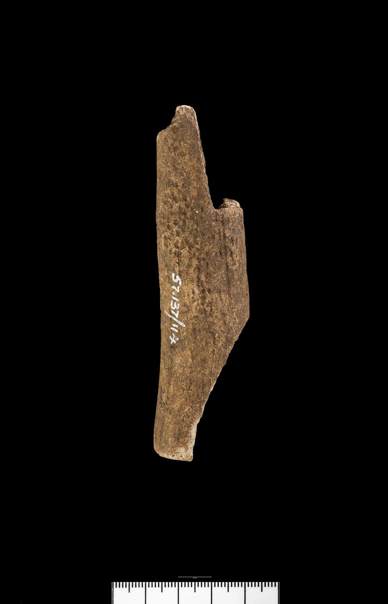 Handle or hilt made from the long bone of a large animal with deeply carved ridge and groove transverse bands and a double triangle at the surviving terminal. Condition: fragment