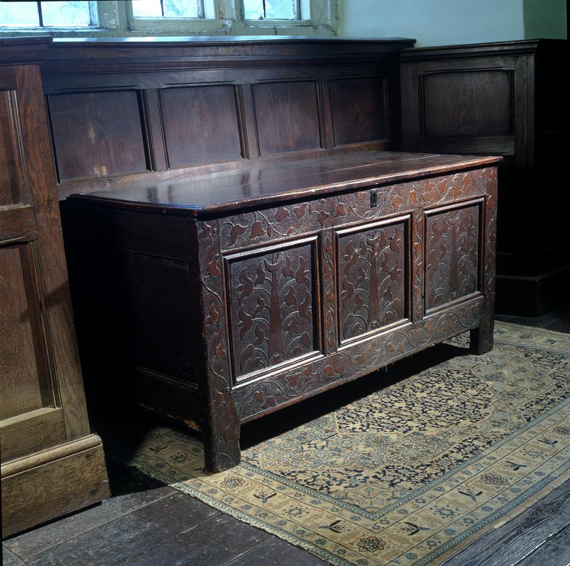 Oak chest-on-stand; coffer includes chest over 2 drawers; stand consists of single drawer and 5 baluster turned legs joined by arcaded stretchers and lap-jointed onto bun feet; front of coffer has inlayed holly scroll and leaf design with initials and date '17 MW 34'; inlay design also on front of the 3 drawers; wooden hinges on coffer lid; coffer of single plank construction; left-hand side drawer still retains paper lining. Initials TM stamped on left side of chest.