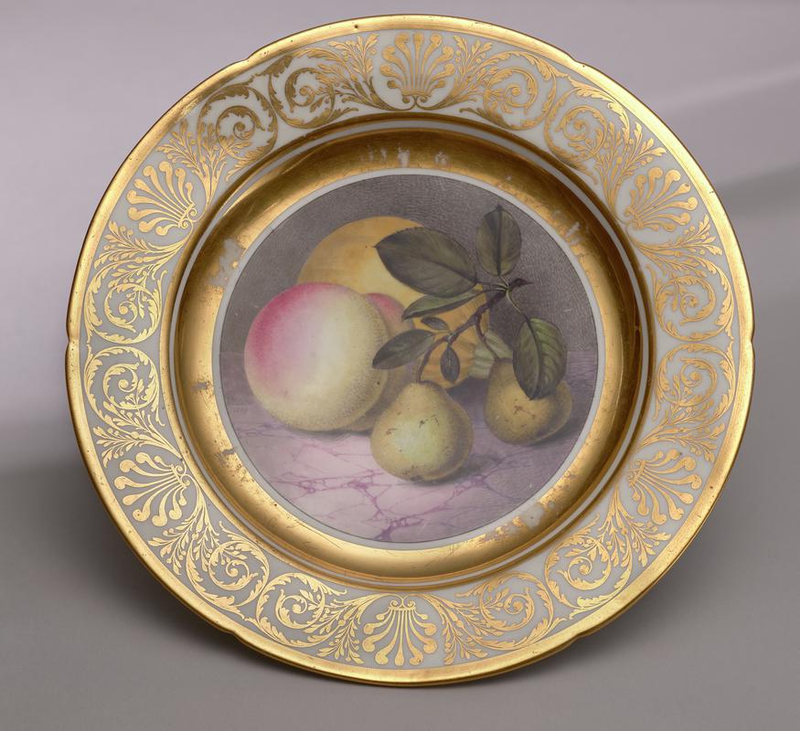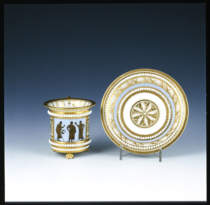 Cup, porcelain with slight whitish translucency, under the foot an intaglio portrait medallion of Thomas Baxter's father, the stepped foot rising to a stem turned in the profile of a face and supporting a plain curved bowl with slightly out-turned rim; elaborately enamelled all over: inside, a portrait of Shakespeare and a marbled white ground with Vitruvian and anthemion scroll bands, outside the bowl with scenes from Shakespeare's 'The Tempest', 'Pericles Prince of Tyre' and 'Cymbeline', the stem with a porphyry ground, the medallion underneath in puce on a dark blue ground.