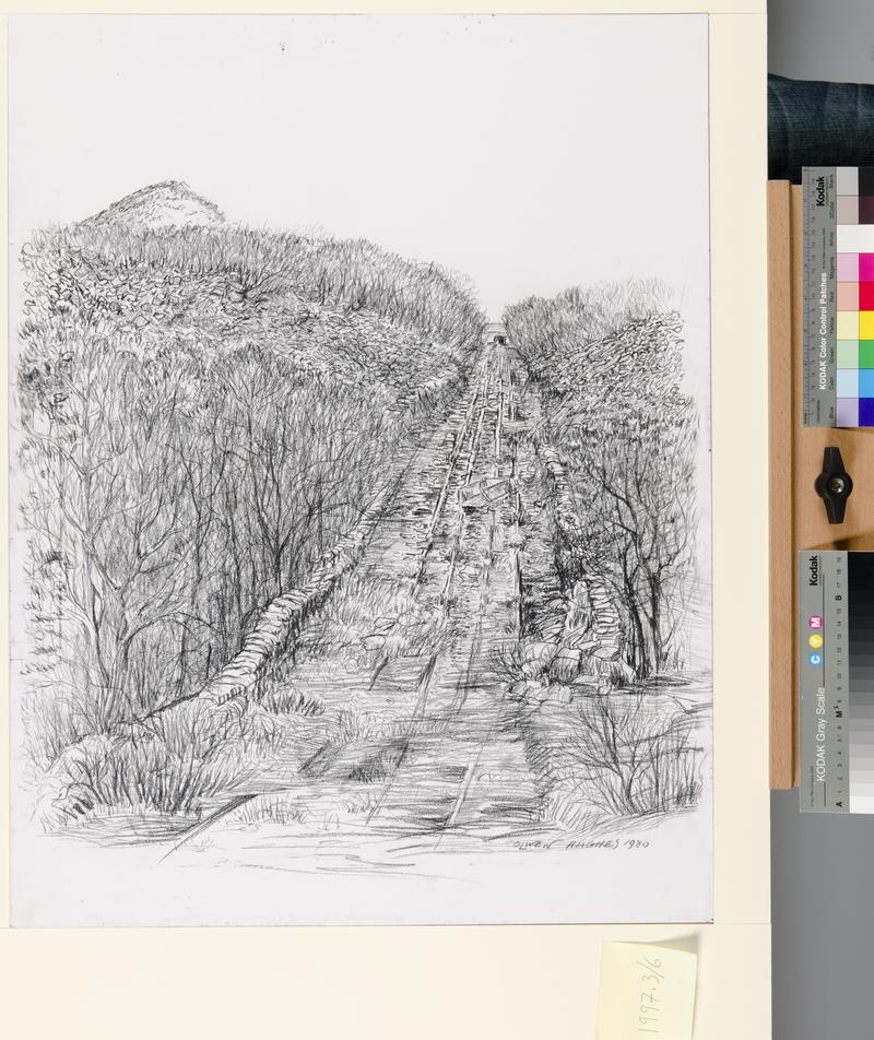 Crayon/pastel on paper drawing of men 'turning a conveyor' on a coal face at Six Bells Colliery. Dismantled conveyor at bottom left. Men building stone packs and erecting wooden roof supports to centre of the picture. Signed 'Chopper' bottom right. Undated. Mounted, framed and glazed.