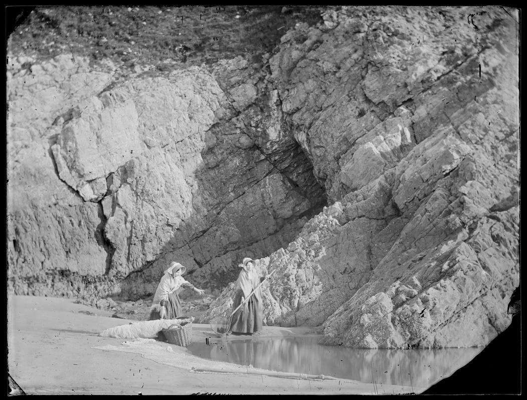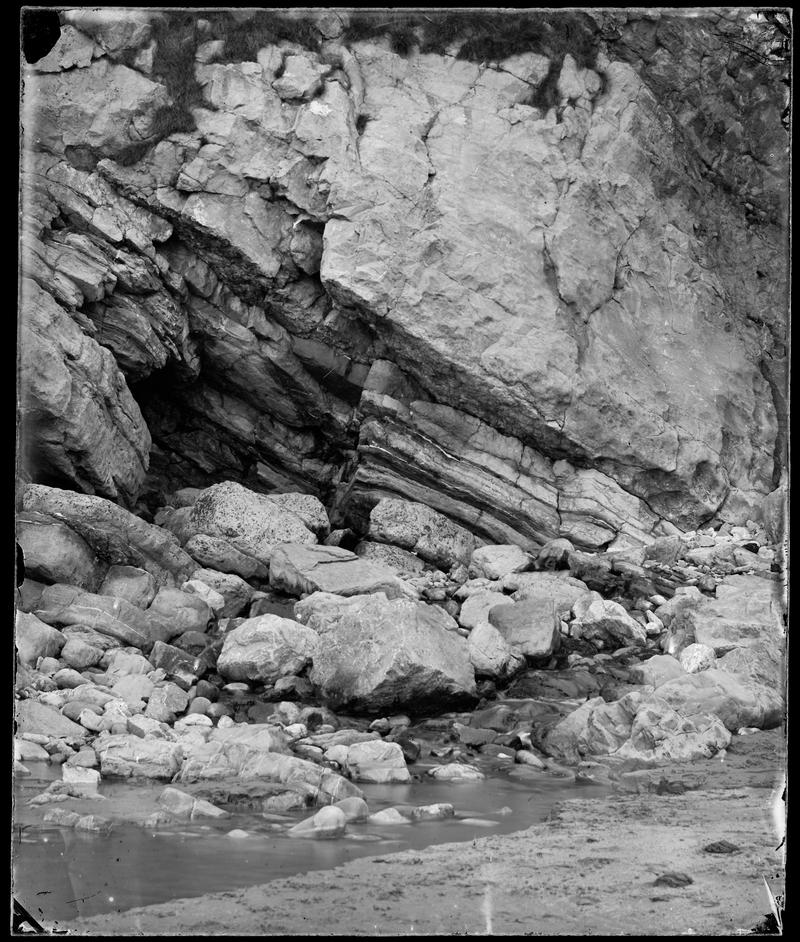Collodion glass negative. Caswell Bay. Sailing vessels can be seen on the horizon.