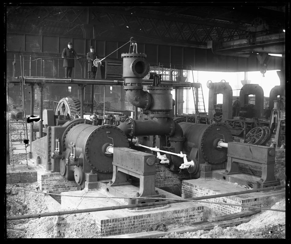 Interior view showing the slabbing mill engine, c.1892. One of the four cross-compound vertical high pressure blast furnace blowing engines by Daniel Adamson & Co, Dukinfield, near Manchester.