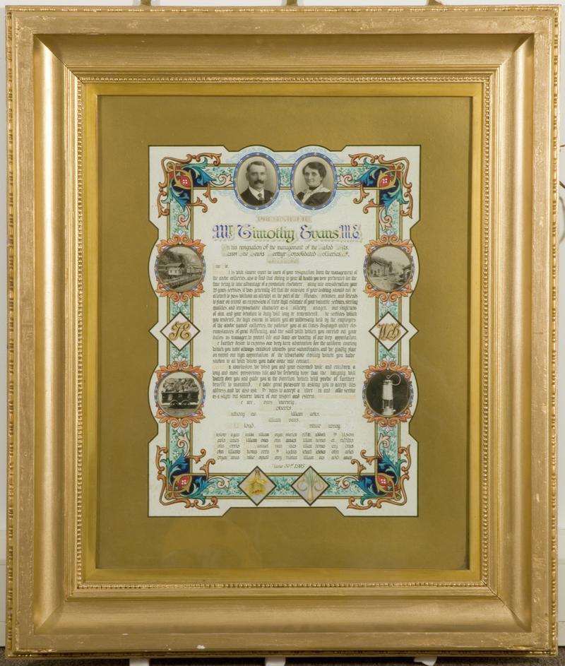 Illuminated address presented to Harry Brean (spelt incorrectly on address) for bravery at Old Black Vein Colliery between July 12th and August 9th 1918. Framed and glazed.