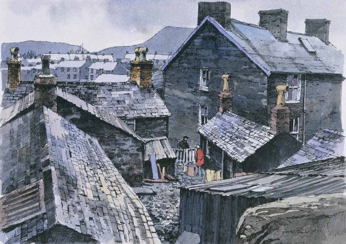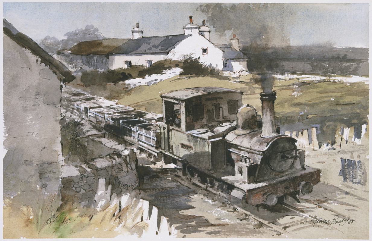 Working mainly in watercolour and gouache, he covered a variety of subjects but in particular, the industrial scene. The dramatic landscapes of North Wales with its slate quarrying towns, served in the past by narrow gauge railways made a deep impression on him. The West Midland industrialscape and urbanscape also provide a wealth of subject matter.