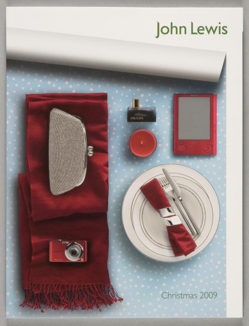 John Lewis furniture catalogue, 2009. Front cover features a black leather chair superimposed on an orange. Back cover features a retro 1950s style green recliner superimposed on a black desk.