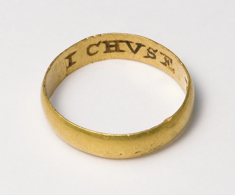 Decorative gold posy-ring. The hoop is of flattened D-shaped section. The outer surface is cast with a repeating pattern of cable pattern cells, originally inlaid with alternating white and blue enamel. Each cell has thre raised gold spots. The inner face of the hoop is inscribed with the text: +LET+LIKING+LAST=, in capitals.