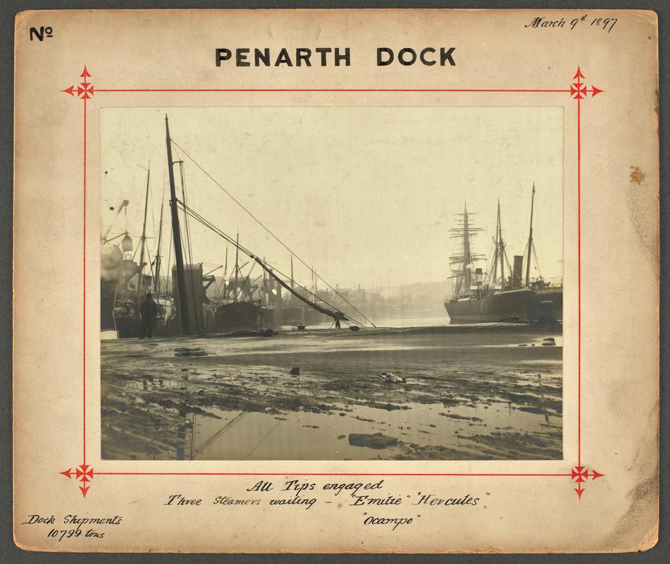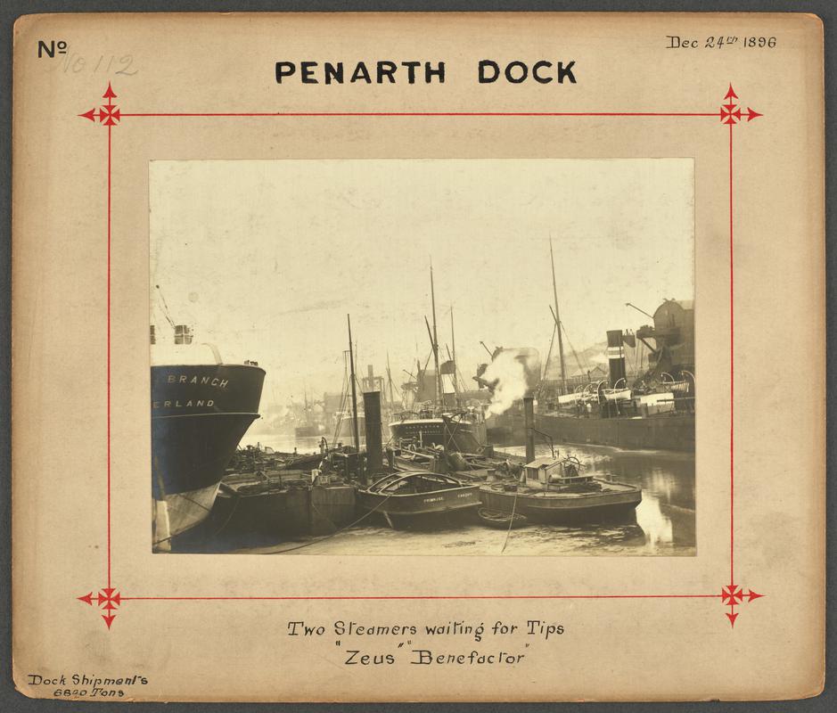 View of S.S.BRUNSWICK waiting for tip, 12 hours, at Penarth Dock. Black and white photograph mounted on cream card with red decorative border.