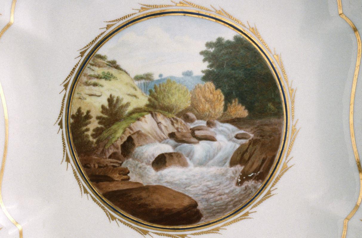 Oval or lozenge-shaped dessert dish, greyish paste, standing on a shallow oval foot rim, fluted everted sides and waved rim; the centre painted with a polychrome landscape comprising a rocky yellow track btween two spreading oak trees, with the upper part of a small gothic tower (the Cold Bath) in the middle distance to the right of the road and with wooded hills beyond, in an oval frame comprising a blue line edged with gold and blue sprays, rim with pendant leaves in gilt below blue band and gilt dentil edge.