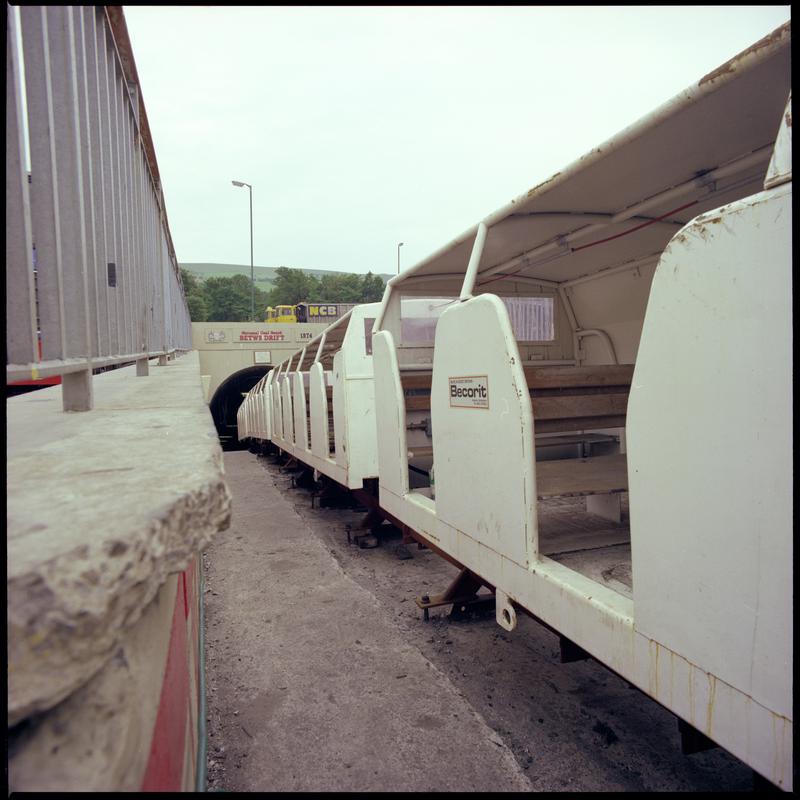Black and white film negative showing pit bottom and the unsupported sandstone roof, Morlais Colliery 1981.