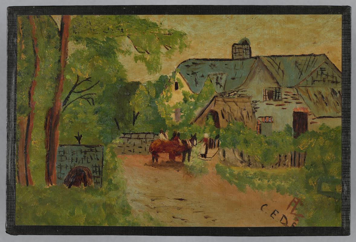 Oil painting showing a mill, waterfall and mountain at Bodhyfryd.