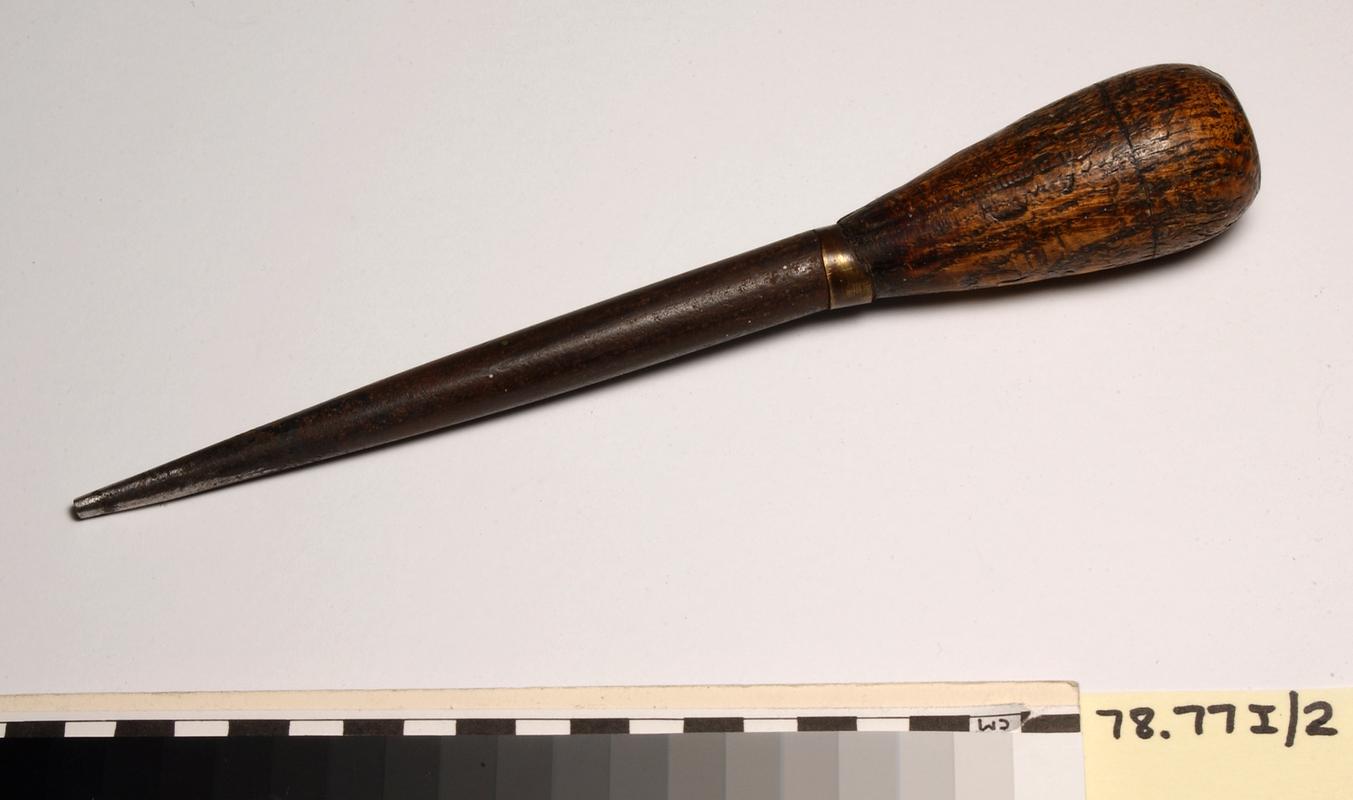 Metal marlin spike bound with cord in a canvas pouch. Originally held in canvas kit bag (2009.22/1) with collection of splicing tools (2009.22/2-15).