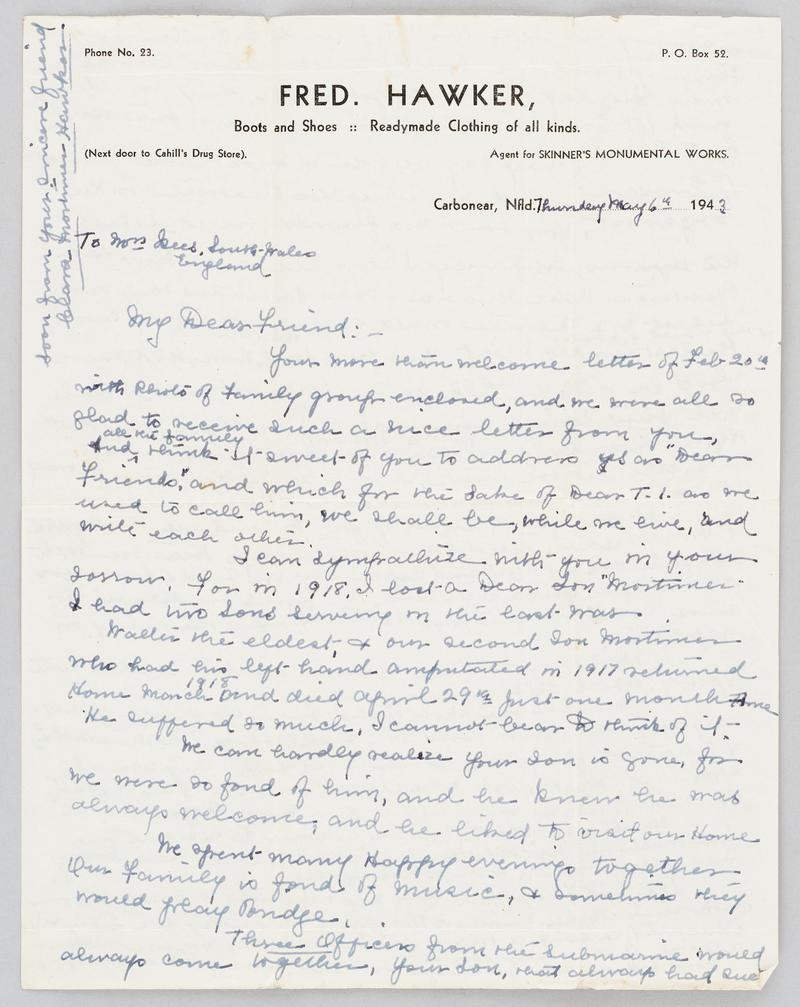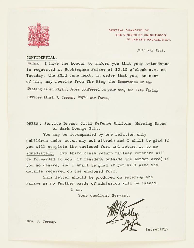 Letter of sympathy from King George VI to Mrs J. Jeremy on the death of her son, Flight Lieutenant Ithel David Jeremy of Pontypridd (service number 77965). He served with the 305 (Polish) Squadron, Royal Air Force Volunteer Reserve, during the Second World War. Killed in action on 15 September 1941, aged 30. Son of Thomas and Jessie Jeremy, Pontypridd.