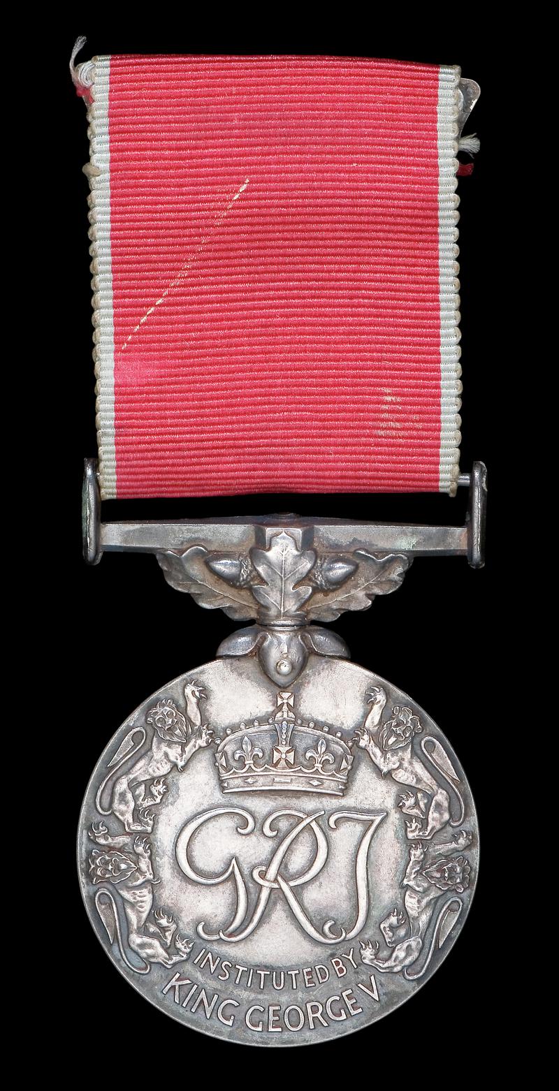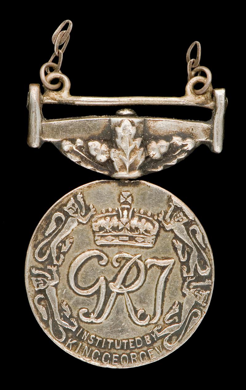 O.B.E. medal in case. Presented by George VI to Mr T.L. Verian. Gilt O.B.E. medal in the shape of cross with round disc at centre. Obverse of disc has profile of King and Queen with words 'For God and the Empire' in band around. Reverse has monogram of King. Above cross is a gilt crown with red & grey ribbon attached. Medal is fixed into a 'velvet' and 'silk' lined box. Box is black with letters 'O.B.E.' in gold on the top.