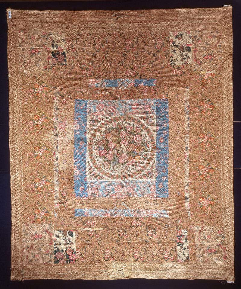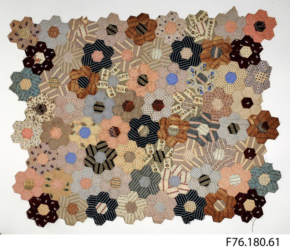 Double-sided crazy patchwork bedcover made from irregular pieces of worsted and flannel in various patterned, striped and plain weave. Seams feather stitched in yellow, edged with black striped flannel. Almost all flannel petticoat fabric (red/black, grey/black/red, plain twill). Given as a wedding gift by the owner of Beulah Woollen Mill, Brecknockshire, in the 1880s.