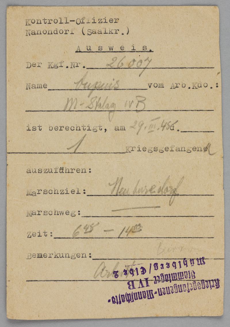 Women's Land Army breeches, 1943-45. Light green velvet corduroy. Front fastened at either side of waist with three buttons. Two slash pockets just below waistband. Wide jodhpur style legs. Tight jodhpur fitting at knee. Fastened at knee with laces (five sets of eyelets). Belt loops in self-fabric at waist (two at front, two at back).