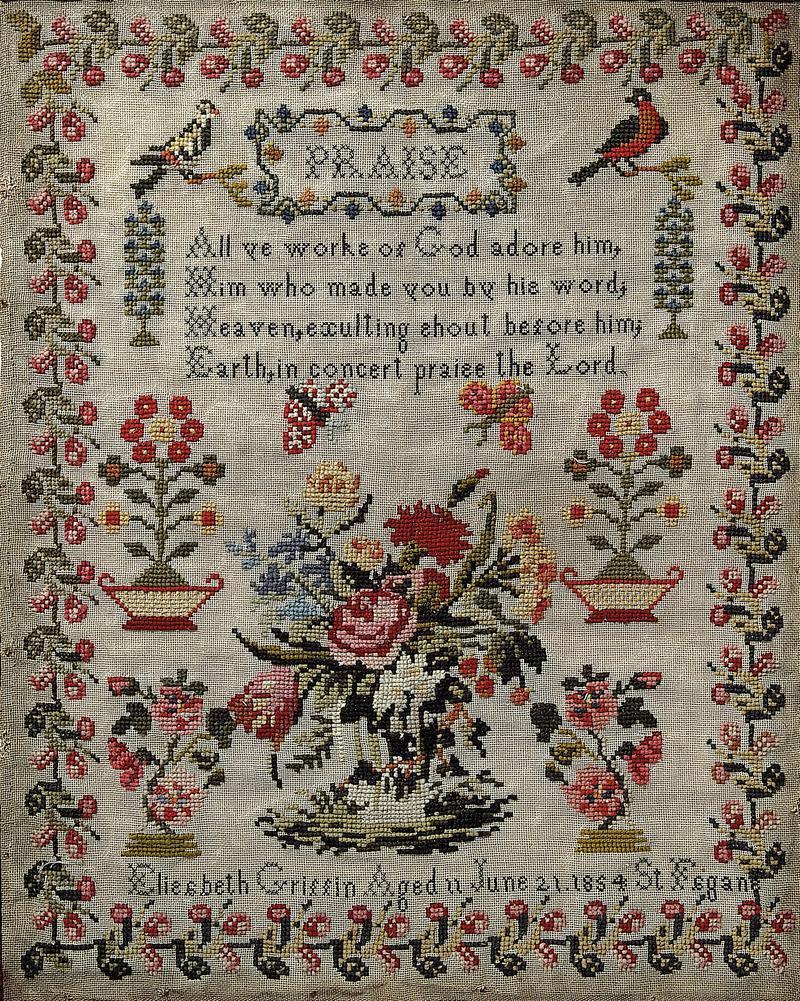 Cotton canvas, embroidered with coloured wools in cross and back stitches. A map of the British Isles. At the foot is the inscription: "Charlotte Thomas 1873". There is a border of double stripes and leaves. (Source: Guide to the Collection of Samplers & Embroideries (Cardiff: National Museum of Wales, 1939) by F.G. Payne).