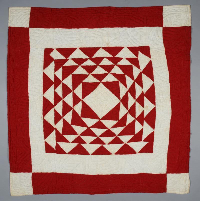 Machine pieced top cover, made from pieces collected during 1970s and 1980s, consisting of some Liberty prints, Liberty lawn and some furnishing fabrics (glazed cottons). Shades of pinks, white, blues and greys; back is wholecloth Liberty fabric, patterned with tiny gingham check. Edged with pleated frill of pink/ blue cotton print. Filling is polyester wadding. Patchwork pattern is made on the cross, forming a chevron patterns with central vertical stripes. All quilting is hand done on a frame, using running stitch in Sylko thread. The quilting follows the patchwork pattern. Maker's label on back.