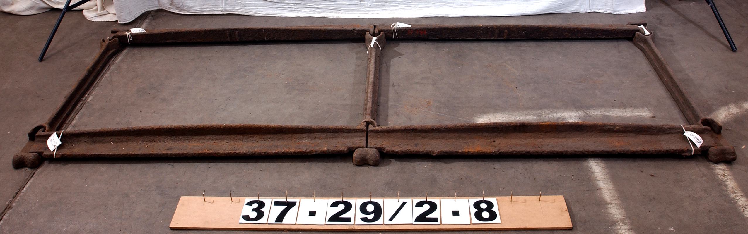 Tramplate with castellated flange. Used when crossing a public road to prevent horse drawn carriages skidding on smooth edgerail. Removed from canal at Llanfoist.