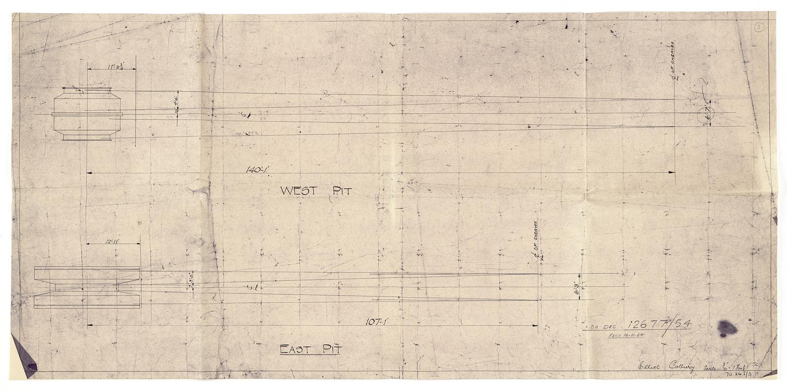 Copy of a blueprint on cream paper. An engineer drawing of the springs for expansion gearing winding engine, East Elliot Pit.