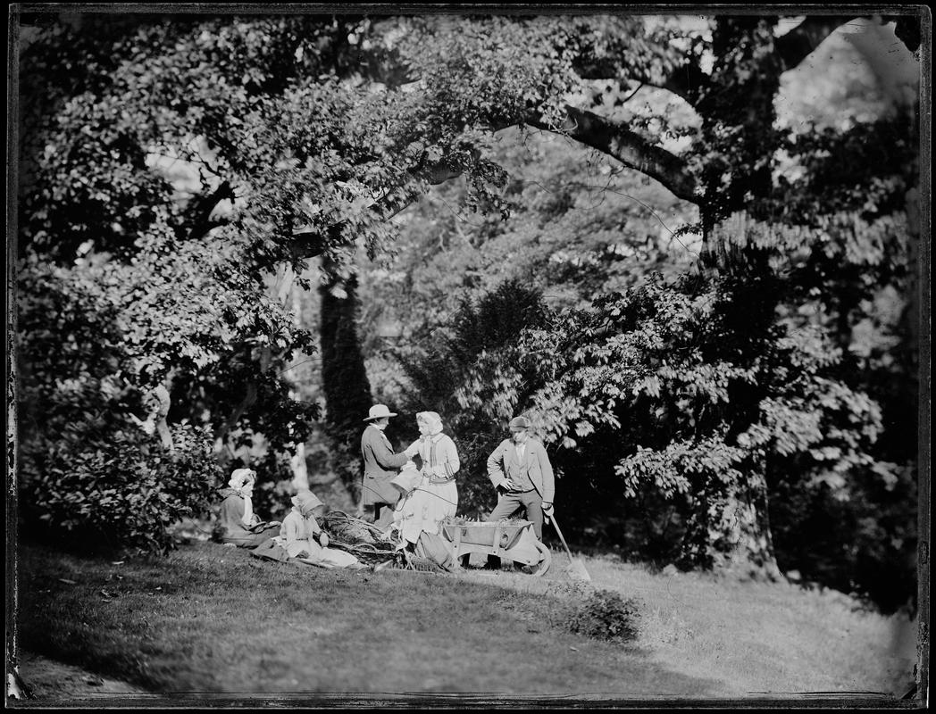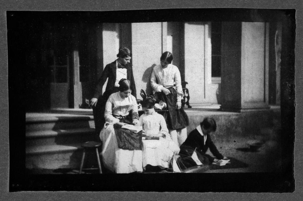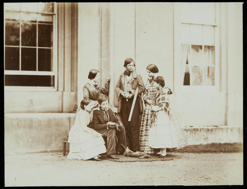 Calotype negative. Llewelyn children birthday group taken infront of the porch at Penllergare House. Toy horse and cart in foreground. Taken by John for his wife Emma's birthday, but he didn't use this version but version 86.31I/304.