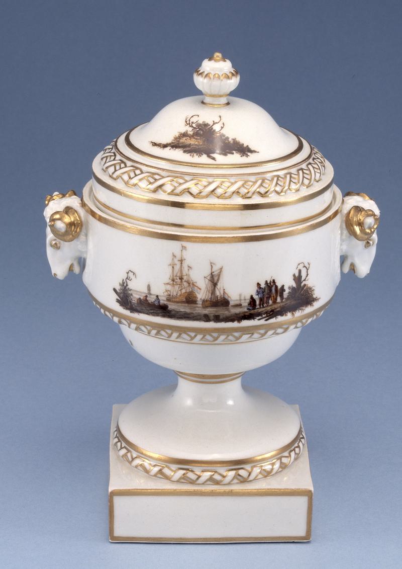 Vase, one of a pair, soft-paste 'duck egg' porcelain; standing on a circular trumpet foot, slender ovoid shape with a thick everted lip; bee handles mounted on shoulder; upper body finely painted with a frieze of wild flowers and strawberries in polychrome enamels; gilt radiating acanthus around base of body, and a gilt band of fruiting vine around the base and neck; gilt handles, and gilt bands to foot rim, shoulder, and everted lip.