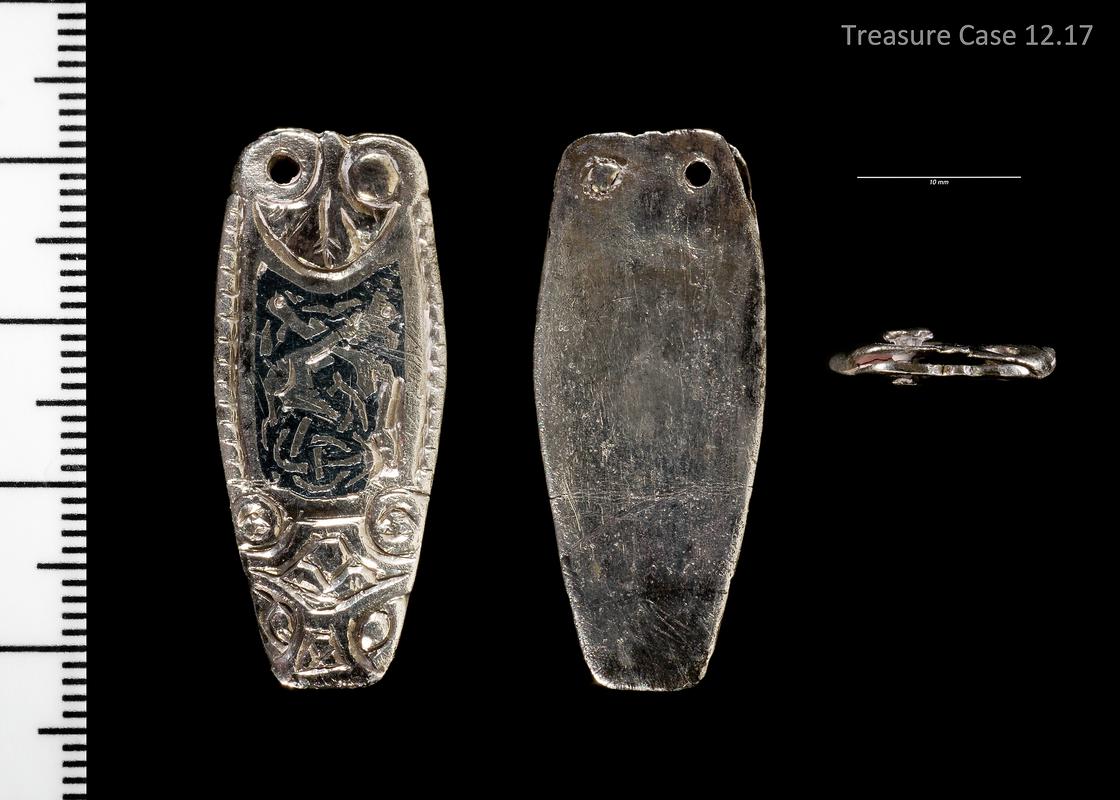 Fragment of a tongue-shaped copper alloy strap end. Rounded edge at tapered end. The main body is decorated with assymetric interlace openwork design, possibly anthropomorphic? The attachment end is broken and the surfaces are worn.