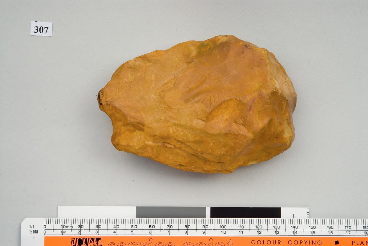 Nodiadau: The absence of iron staining indicates that the handaxe has not been in a river deposit. It was probably resting on the surface before incorporation into last glaciation deposits (which form the cliffs at Rhossili), before deposition by wave erosion on the beach.