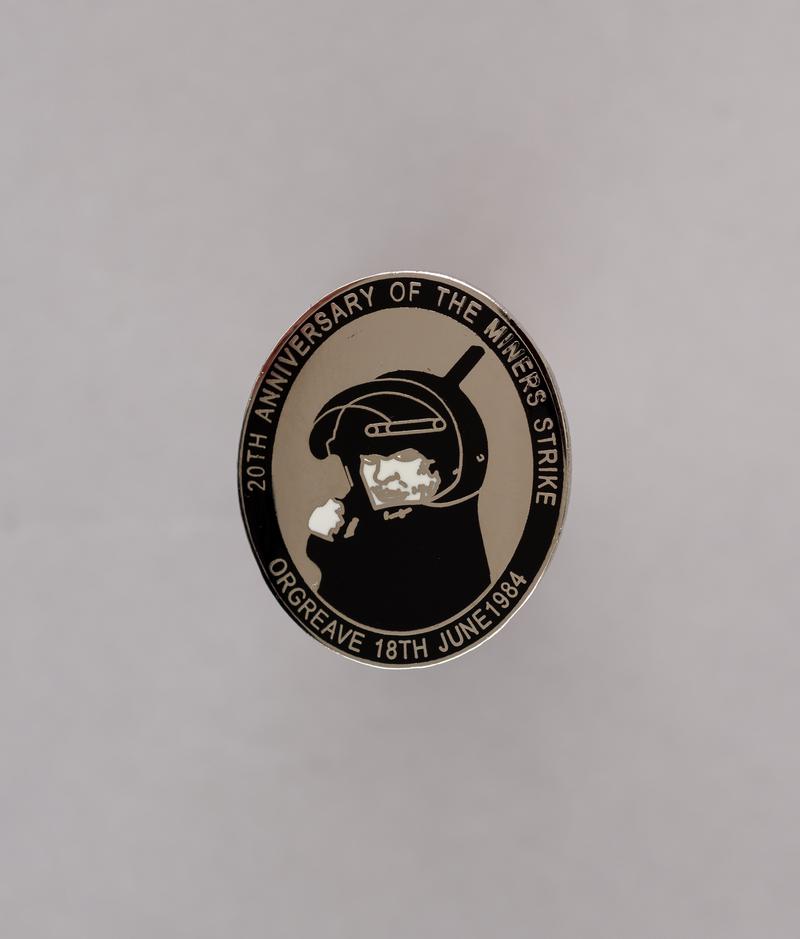 Circular brass badge depicting two figures supporting the arms of the NUM with inscription around. Set in red and dark blue enamel. Clasp on reverse.