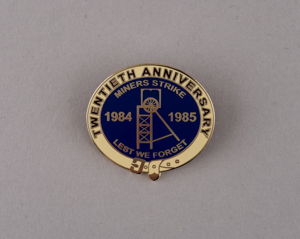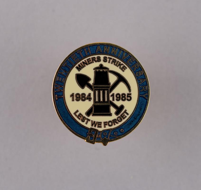 Circular brass badge depicting two figures supporting the arms of the NUM with inscription around. Set in red and dark blue enamel. Clasp on reverse.