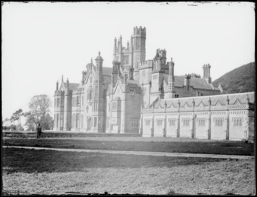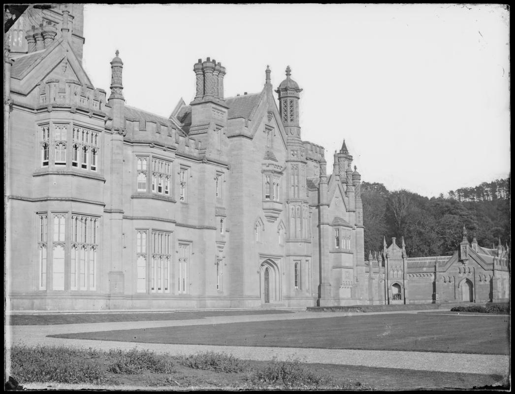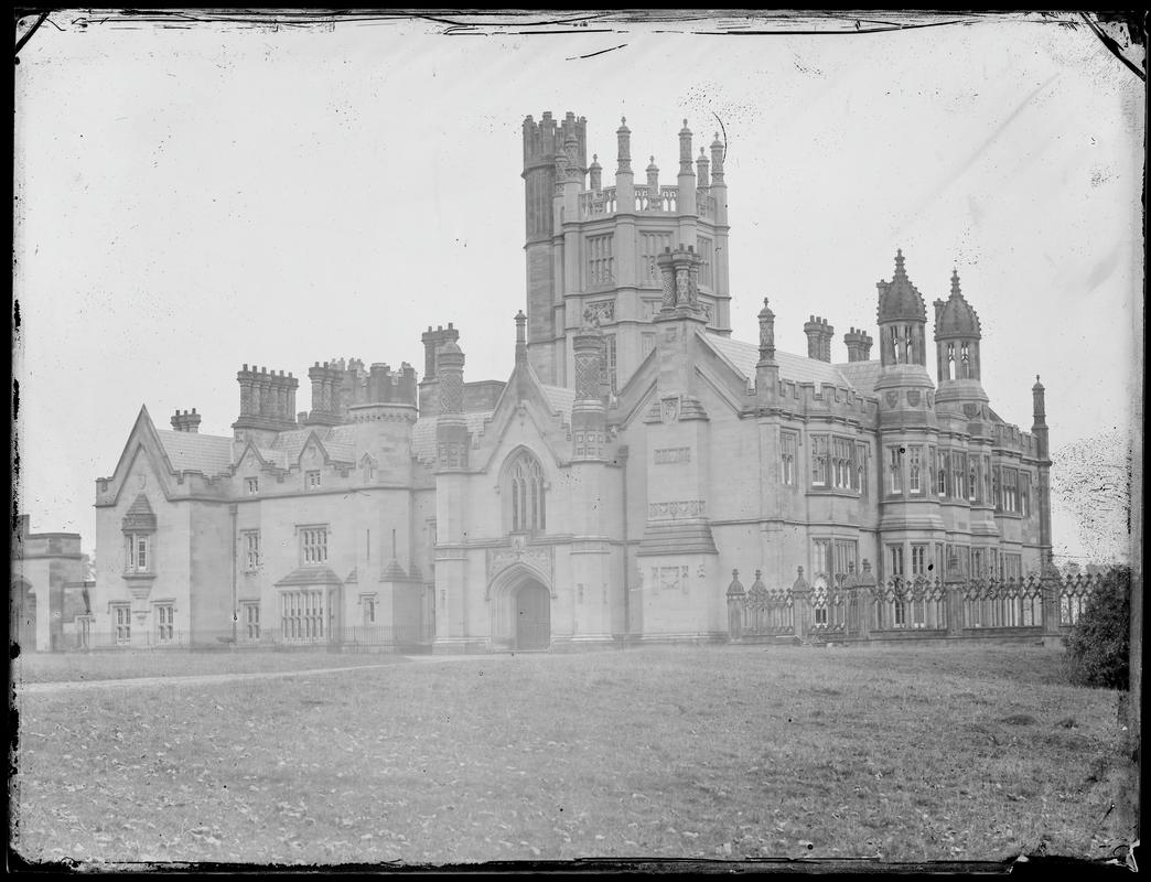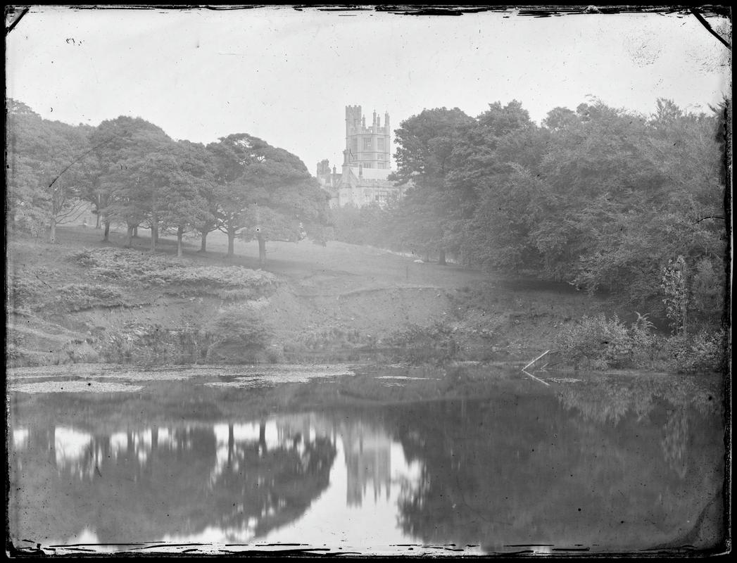 Collodion glass negative. Glasshouse/greenhouse and pond at Margam Castle. Alternative title - 'The Great Bay Tree & The Great Wood, Margam' and 'The Orangery, Margam Park'.