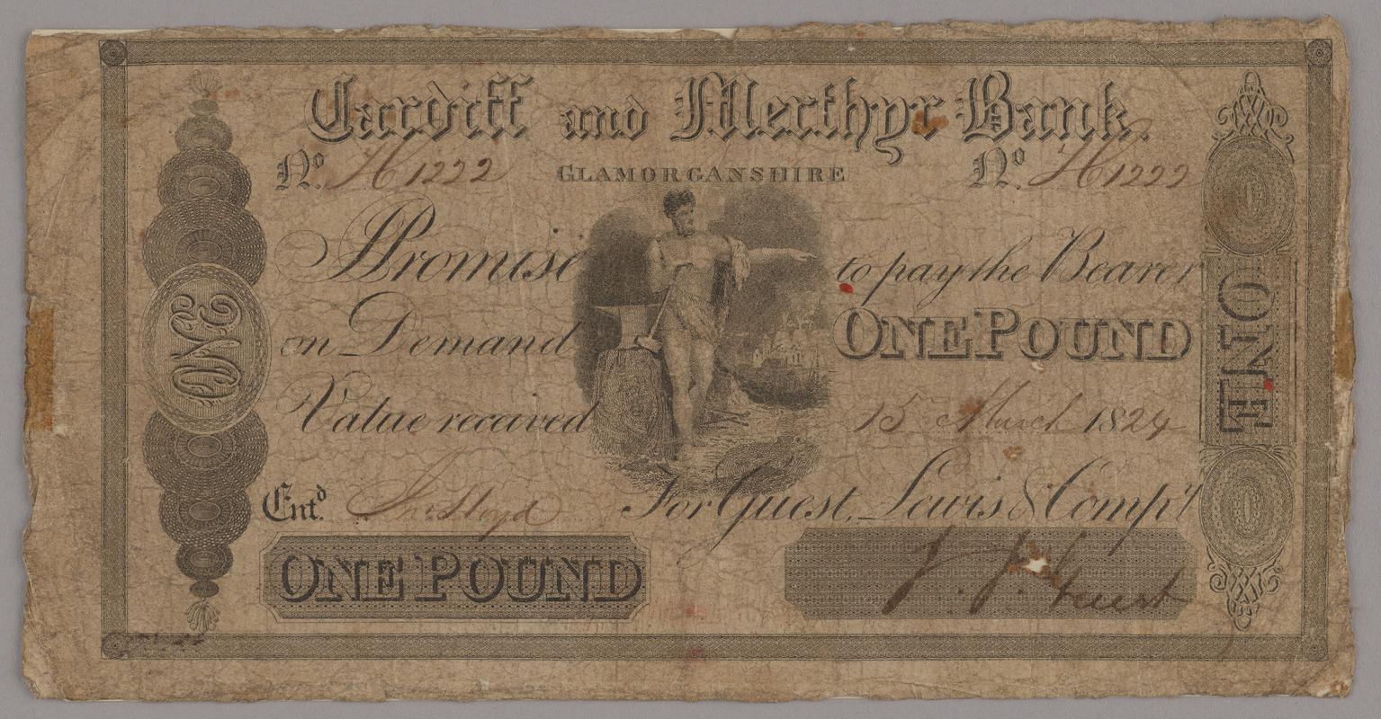 Print of a 'Welsh-Pool Bank, Montgomeryshire' one pound bank note. Numbered 1249. Signed by George Mears for George Mears and Matthew Jones. Dated 28 August 1809.