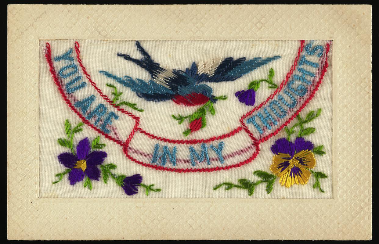 Embroidered postcard inscribed '1917 Souvenir from France'. Handwritten message on back. Dated 17 October 1917. Sent to Miss Evelyn Hussey, sister of Corporal Hector Hussey of the Royal Welch Fusiliers, during the First World War.