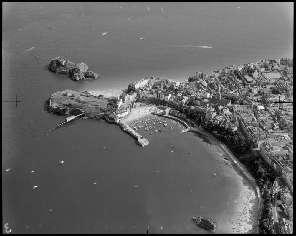 Aerial view of Cardiff Castle. Labelled on reverse with photographer's details.