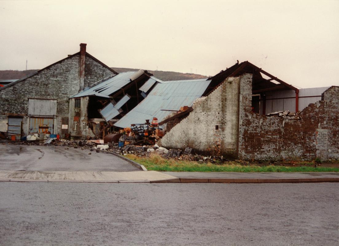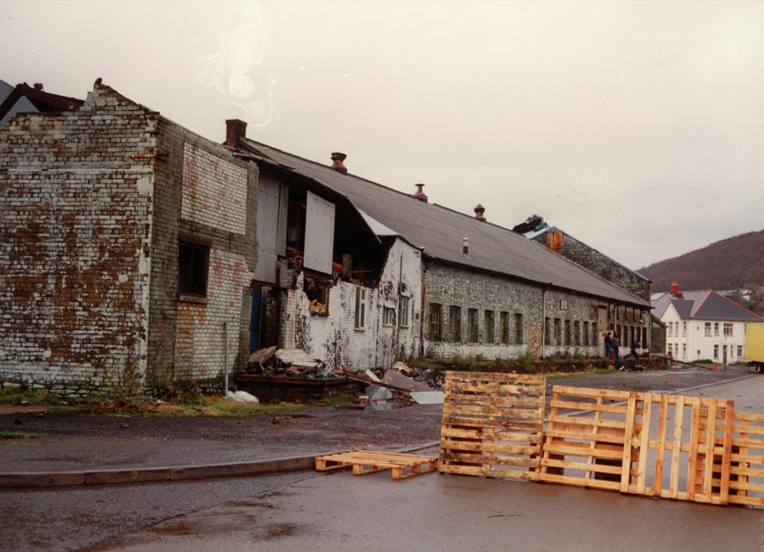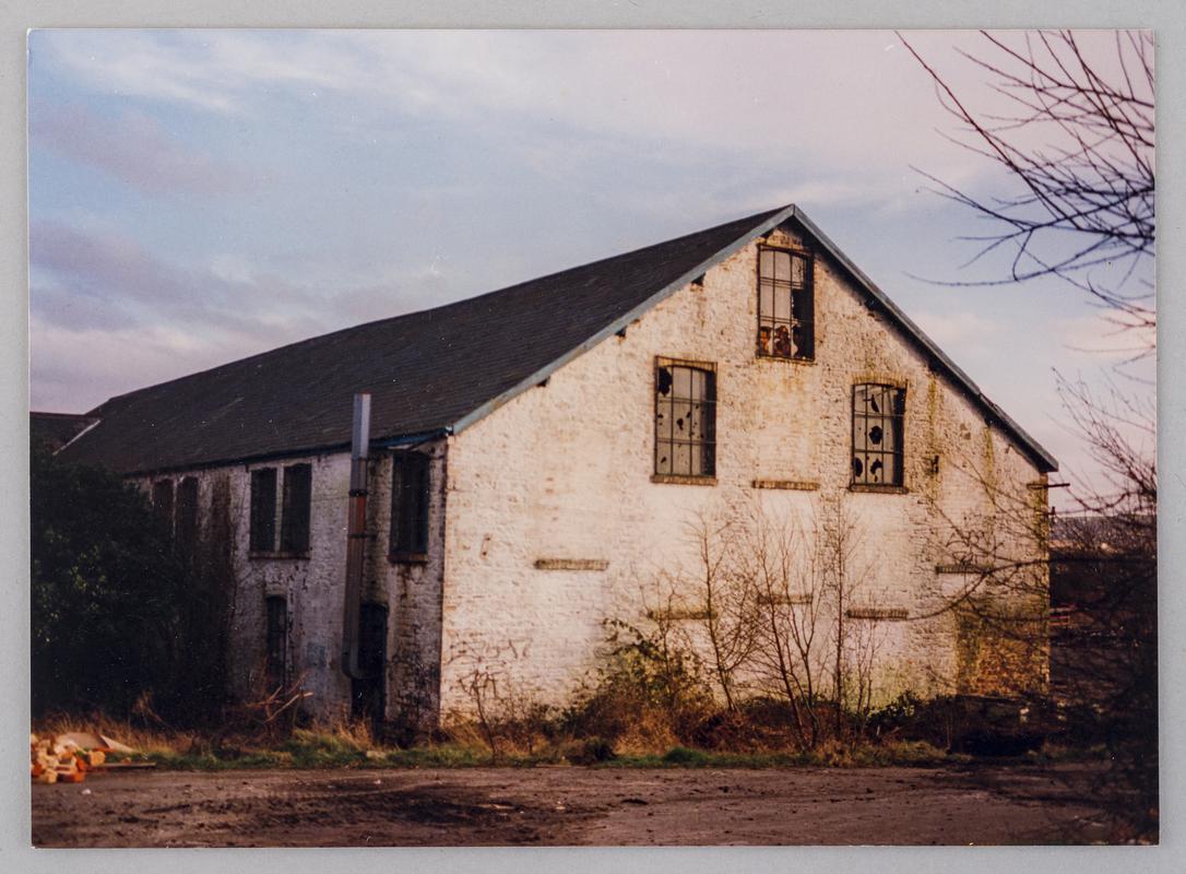Looking south west at Pontardawe Tinplate Works, Pontardawe showing south end of tinhouse (right) and assorting room south façade (left), October 1994.